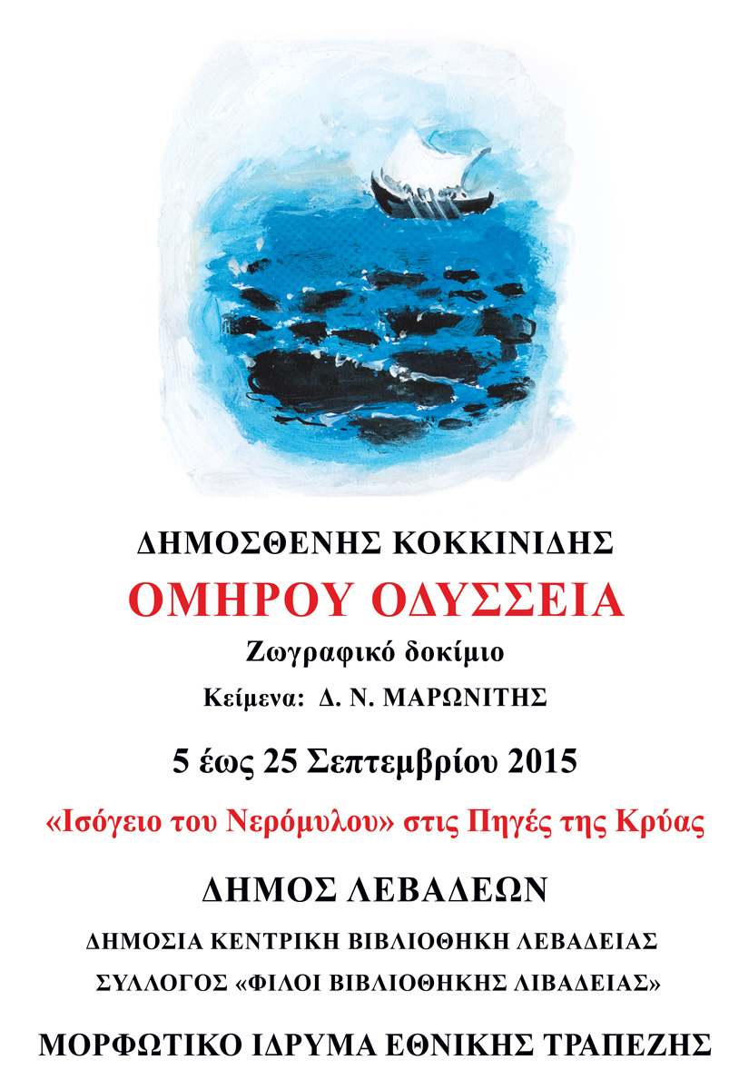Η Δημόσια Κεντρική Βιβλιοθήκη Λιβαδειάς, ο Δήμος Λεβαδέων, το Μορφωτικό Ίδρυμα Εθνικής Τραπέζης και ο σύλλογος «ΦΙΛΟΙ ΒΙΒΛΙΟΘΗΚΗΣ ΛΙΒΑΔΕΙΑΣ» συνδιοργανώνουν έκθεση με τίτλο: ΔΗΜΟΣΘΕΝΗΣ ΚΟΚΚΙΝΙΔΗΣ - ΟΜΗΡΟΥ ΟΔΥΣΣΕΙΑ, Ζωγραφικό δοκίμιο.