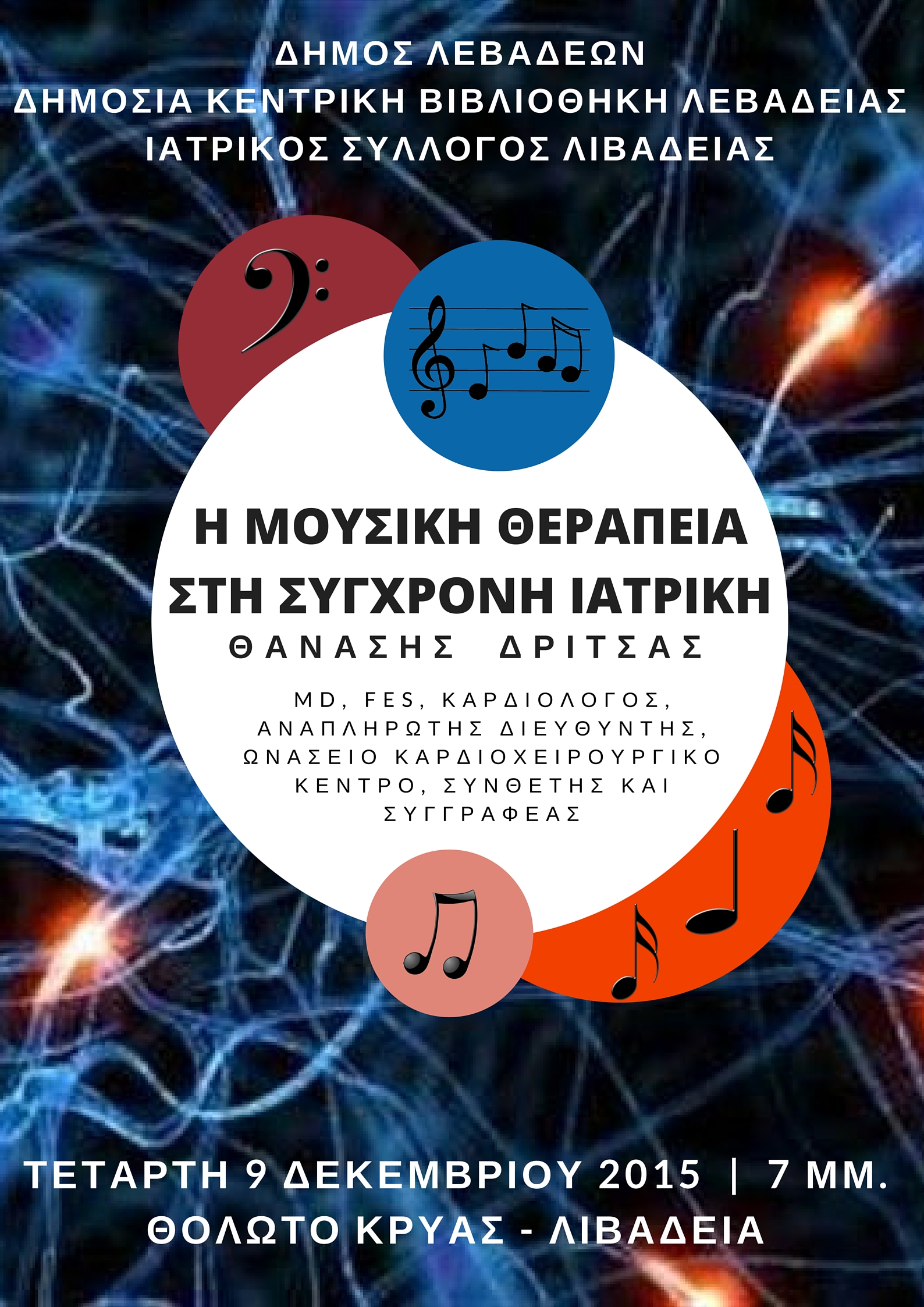 Η Δημόσια Κεντρική Βιβλιοθήκη Λεβαδείας, ο Δήμος Λεβαδέων και ο Ιατρικός Σύλλογος Λιβαδειάς διοργανώνουν εκδήλωση με θέμα «Η μουσική θεραπεία στη σύγχρονη ιατρική».