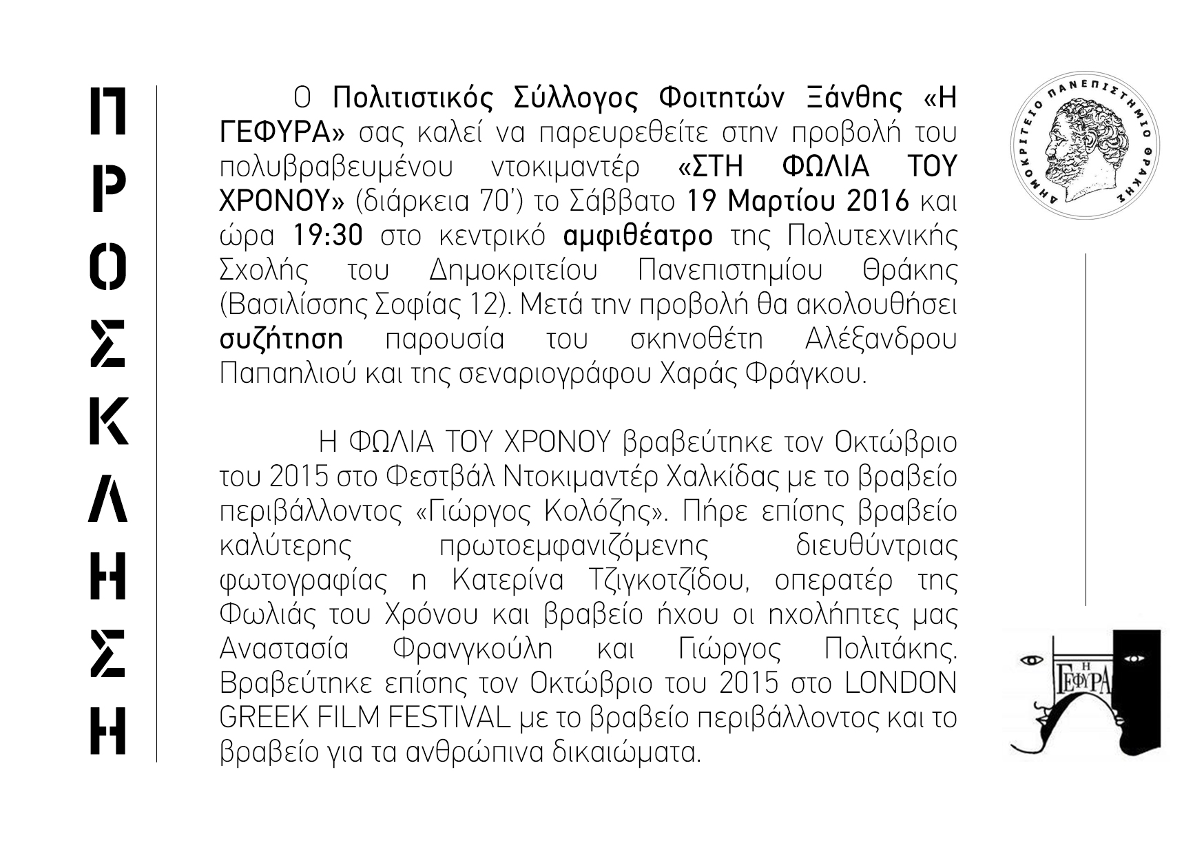 Ο Πολιτιστικός Σύλλογος Φοιτητών Ξάνθης "Η Γέφυρα" σας καλεί να παρευρεθείτε στην προβολή του πολυβραβευμένου ντοκιμαντέρ "Στη Φωλιά του Χρόνου" (διάρκεια 70') το Σάββατο 19 Μαρτίου 2016 και ώρα 19:30 στο κεντρικό Αμφιθέατρο της Πολυτεχνικής Σχολής του Δ.Π.Θ. (Βασ. Σοφίας 12).