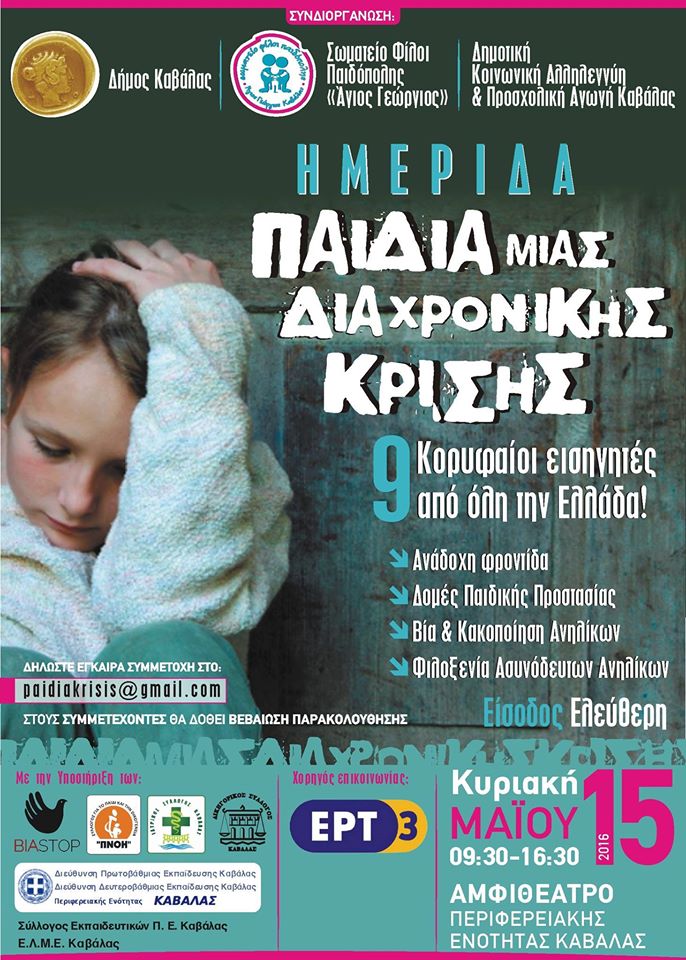 Το Σωματείο Φίλων Παιδόπολης Καβάλας "Ο Άγιος Γεώργιος" συνδιοργανώνει με το Δήμο Καβάλας επιστημονική ημερίδα με θέμα: "Παιδιά μιας Διαχρονικής Κρίσης".