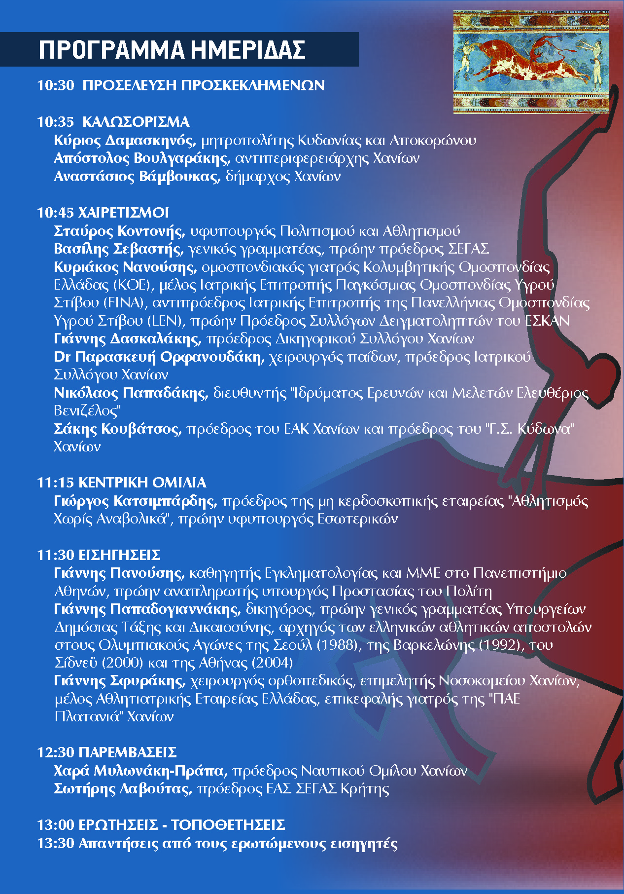 - Γιάννης Σφυράκης, χειρούργος ορθοπεδικός, επιμελητής Νοσοκομείου Χανίων, μέλος Αθλητιατρικής Εταιρείας Ελλάδας, επικεφαλής γιατρός της ¨ΠΑΕ Πλατανιάς Χανίων, με τίτλο «Μια ιατρική ματιά στην φαρμακοδιέγερση και οι επιπτώσεις στην υγεία».