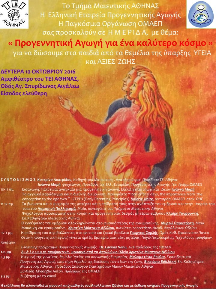 Το Τμήμα Μαιευτικής του ΤΕΙ Αθήνας, η Ελληνική Εταιρεία Προγεννητικής Αγωγής και η Παγκόσμια Οργάνωση ΟΜΑΕΠ σας προσκαλούν σε ημερίδα με θέμα: “Προγεννητική Αγωγή για ένα καλύτερο κόσμο” την Δευτέρα 10 Οκτωβρίου 2016 και ώρα 10:00 στο Συνεδρικό Κέντρο του ΤΕΙ Αθήνας.
