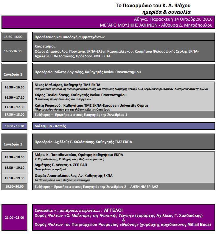 Η βυζαντινομουσικολογική ημερίδα: Το Παναρμόνιο του Κ. Α. Ψάχου οργανώνεται από το Τμήμα Μουσικών Σπουδών της Φιλοσοφικής Σχολής του ΕΚΠΑ με την ευκαιρία της επετείου των 25 ετών από την ίδρυσή του.