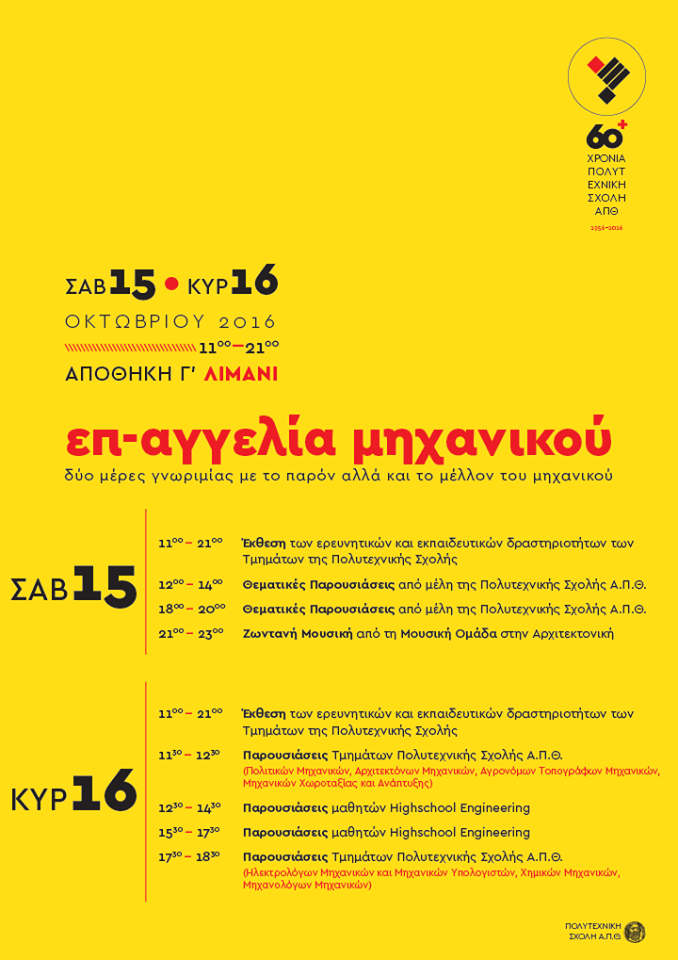 Η Πολυτεχνική σχολή το Αριστοτέλειου Πανεπιστημίου Θεσσαλονίκης διοργανώνουν την εκδήλωση: "Επ- αγγελία- Ένα διήμερο εκδηλώσεων γνωριμίας με το παρόν αλλά και το μέλλον του μηχανικού".