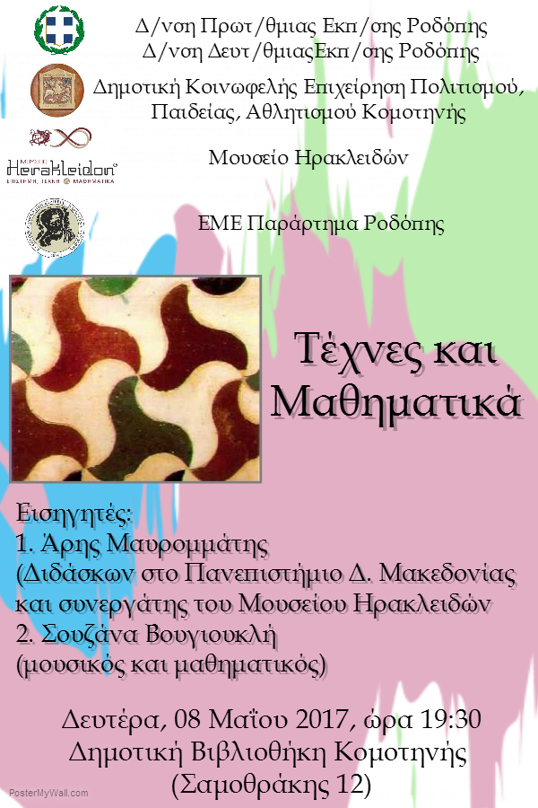 Οι Διευθύνσεις Πρωτ/θμιας και Δευτ/θμιας Εκπ/σης ΠΕ Ροδόπης, δια των Γραφείων Σχολικών Δραστηριοτήτων, σε συνεργασία με τη Δημοτική Κοινωφελή Επιχείρηση Πολιτισμού, Παιδείας, Αθλητισμού Κομοτηνής, το Μουσείο Ηρακλειδών και την Ελληνική Μαθηματική Εταιρεία - Παράρτημα Ροδόπης, διοργανώνουν επιμορφωτική εκδήλωση με θέμα: «Τέχνες και Μαθηματικά». Η εκδήλωση θα πραγματοποιηθεί τη Δευτέρα, 08 Μαΐου 2017, ώρα 19:30, στην Αίθουσα Εκδηλώσεων της Δημοτικής Βιβλιοθήκης (Οδός Σαμοθράκης 12).