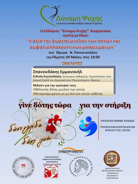 Ο Σύλλογος Καρκινοπαθών και Φίλων Ροδόπης, "Δύναμη Ψυχής", διοργανώνει ομιλία με θέμα: η αξία της δωρεάς μυελού των οστών και ομφαλιοπλακουντικών μοσχευμάτων. Η εκδήλωση θα πραγματοποιηθεί την Πέμπτη 4 Μαΐου, στις 18:00, στο Ίδρυμα Παπανικολάου, στην Κομοτηνή.
