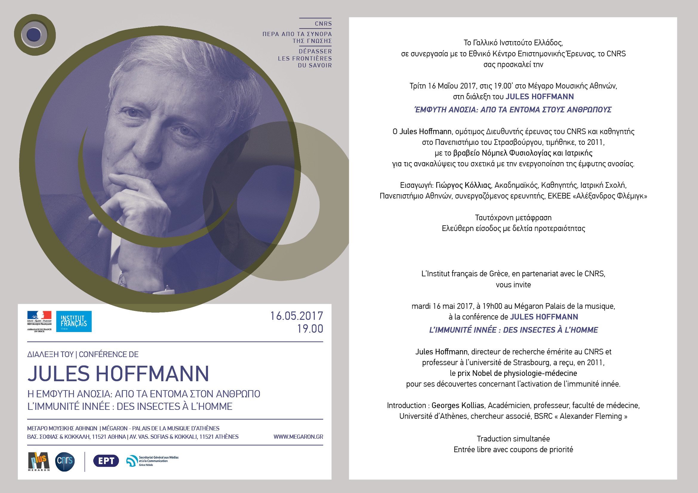 Το Γαλλικό Ινστιτούτο Ελλάδος, σε συνεργασία με το Εθνικό Κέντρο Επιστημονικής Έρευνας, το CNRS, προσκαλεί κάθε ενδιαφερόμενο την Τρίτη 16 Μαΐου 2017, στις 19.00’, στο Μέγαρο Μουσικής Αθηνών, στη διάλεξη του Jules Hoffmann με τίτλο: Έμφυτη Ανοσία: από τα έντομα στους ανθρώπους.