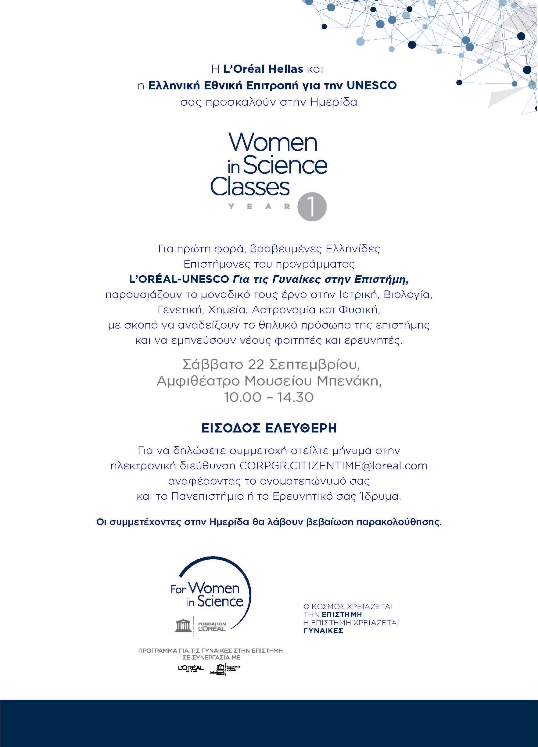 Στο πλαίσιο της 20ής επετείου του Διεθνούς Προγράμματος UNESCO/Fondation L’Oreal "Για τις Γυναίκες στην Επιστήμη", διοργανώνεται σειρά εκδηλώσεων ως εξής: