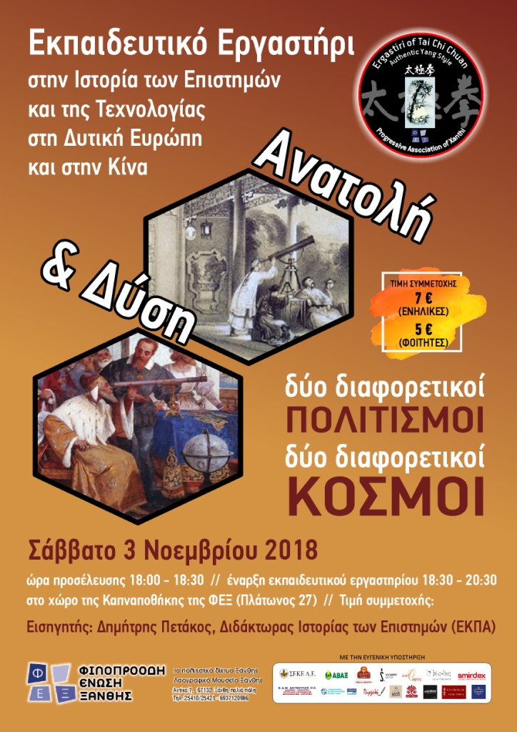 - Εκπαιδευτικό εργαστήρι για την Ιστορία των επιστημών και της τεχνολογίας στην Δυτική Ευρώπη και την Κίνα ‘Ανατολή και Δύση: Δύο διαφορετικοί πολιτισμοί, δύο διαφορετικοί κόσμοι’