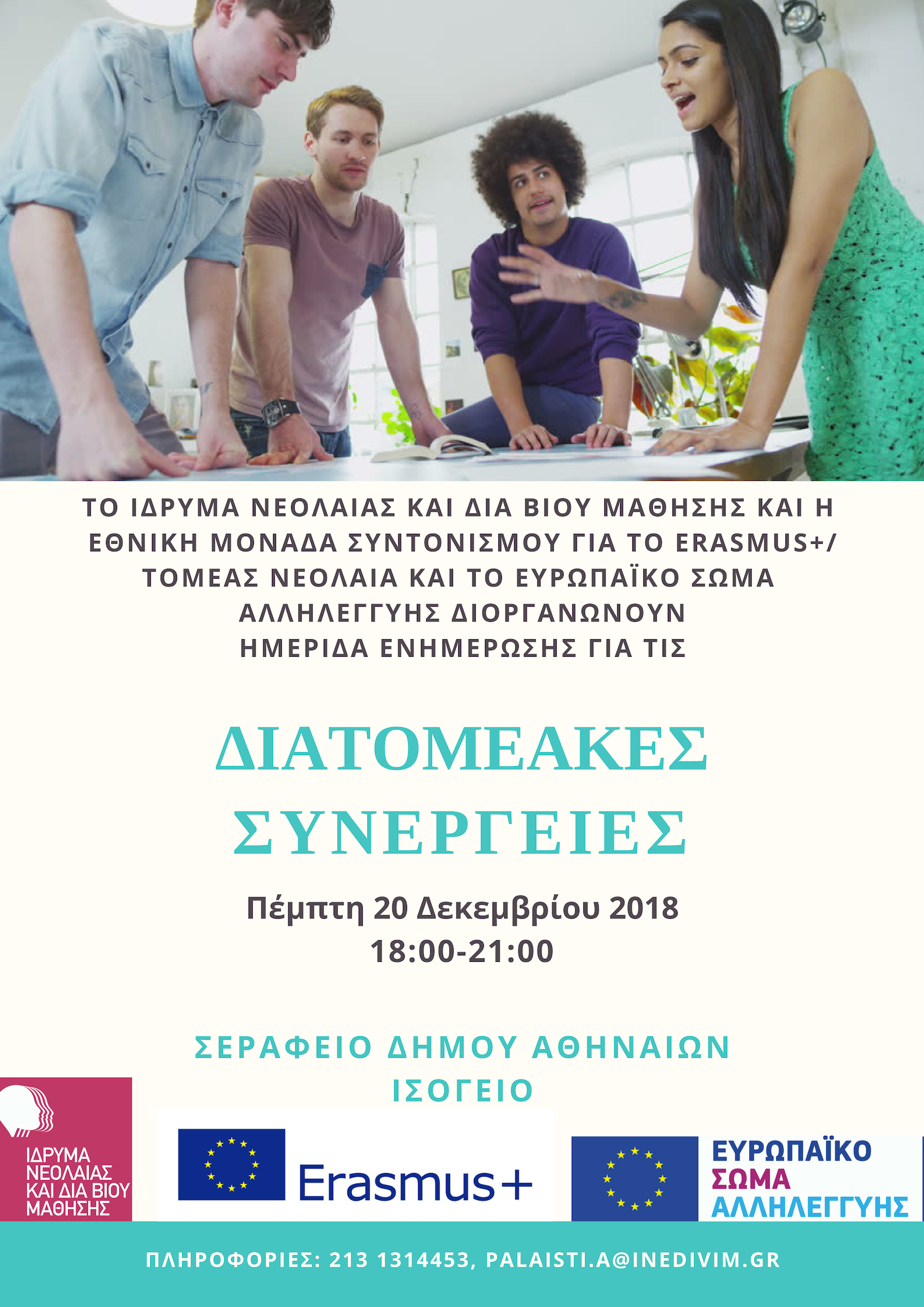 Το Ίδρυμα Νεολαίας και Διά Βίου Μάθησης ως Εθνική Μονάδα Συντονισμού για τα προγράμματα Erasmus+/Τομέας Νεολαία και Ευρωπαϊκό Σώμα Αλληλεγγύης, σας προσκαλεί στην ενημερωτική εκδήλωση που θα λάβει χώρα την Πέμπτη, 20 Δεκεμβρίου 2018 από τις 18:00 μέχρι τις 21:00 στο Σεράφειο του Δήμου Αθηναίων (ισόγειο), με θέμα τις Διατομεακές Συνέργειες.